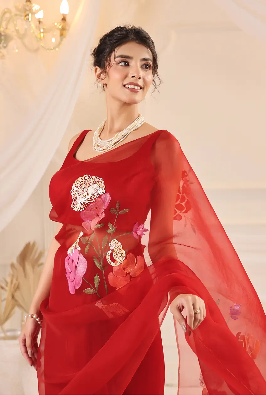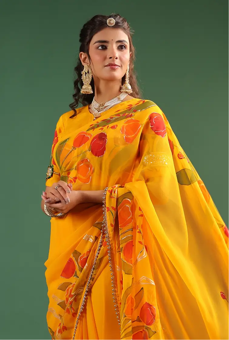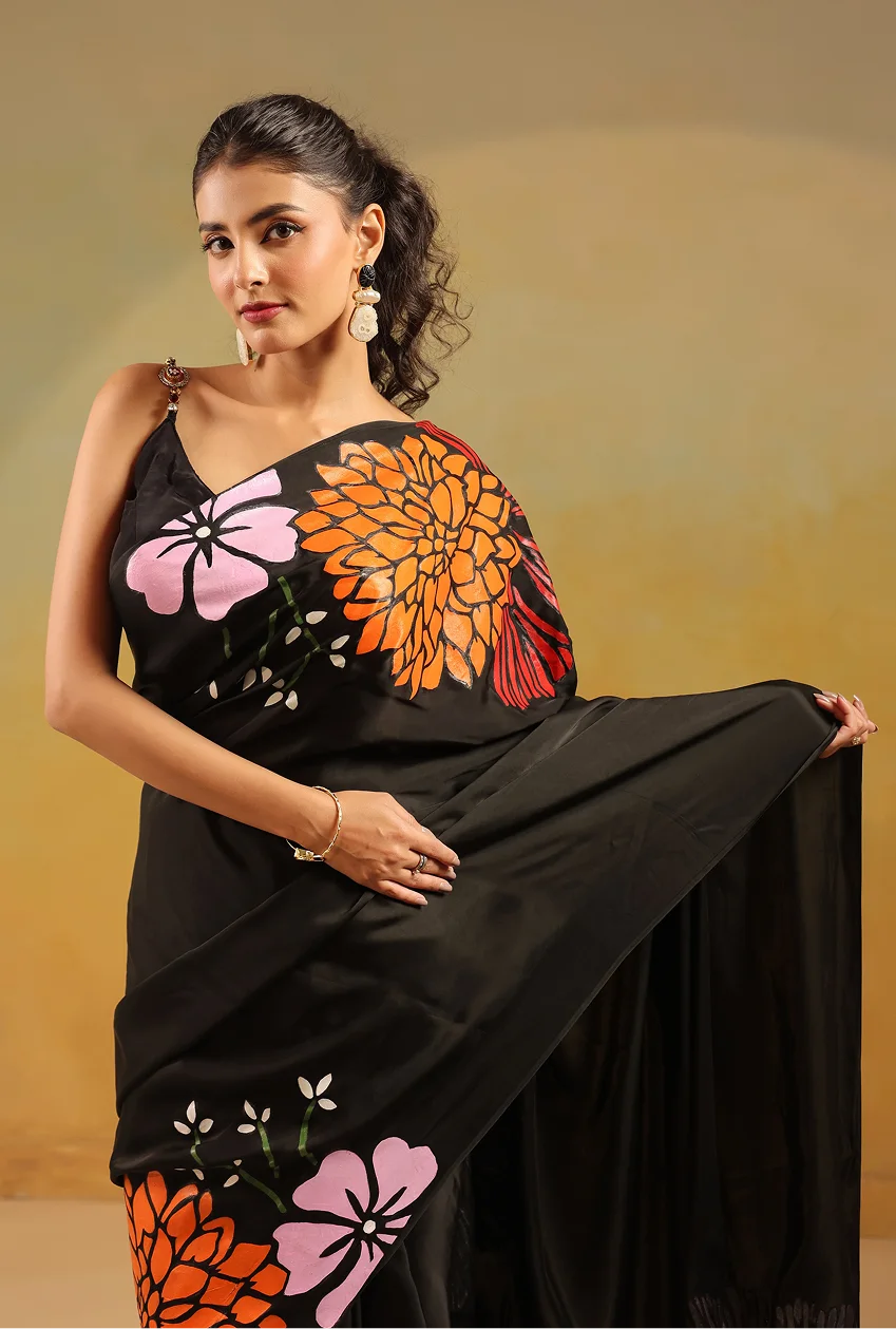 Hand-painted florals and architectural details on crepe, georgette, chinon, and chanderi – modern heirloom sarees.